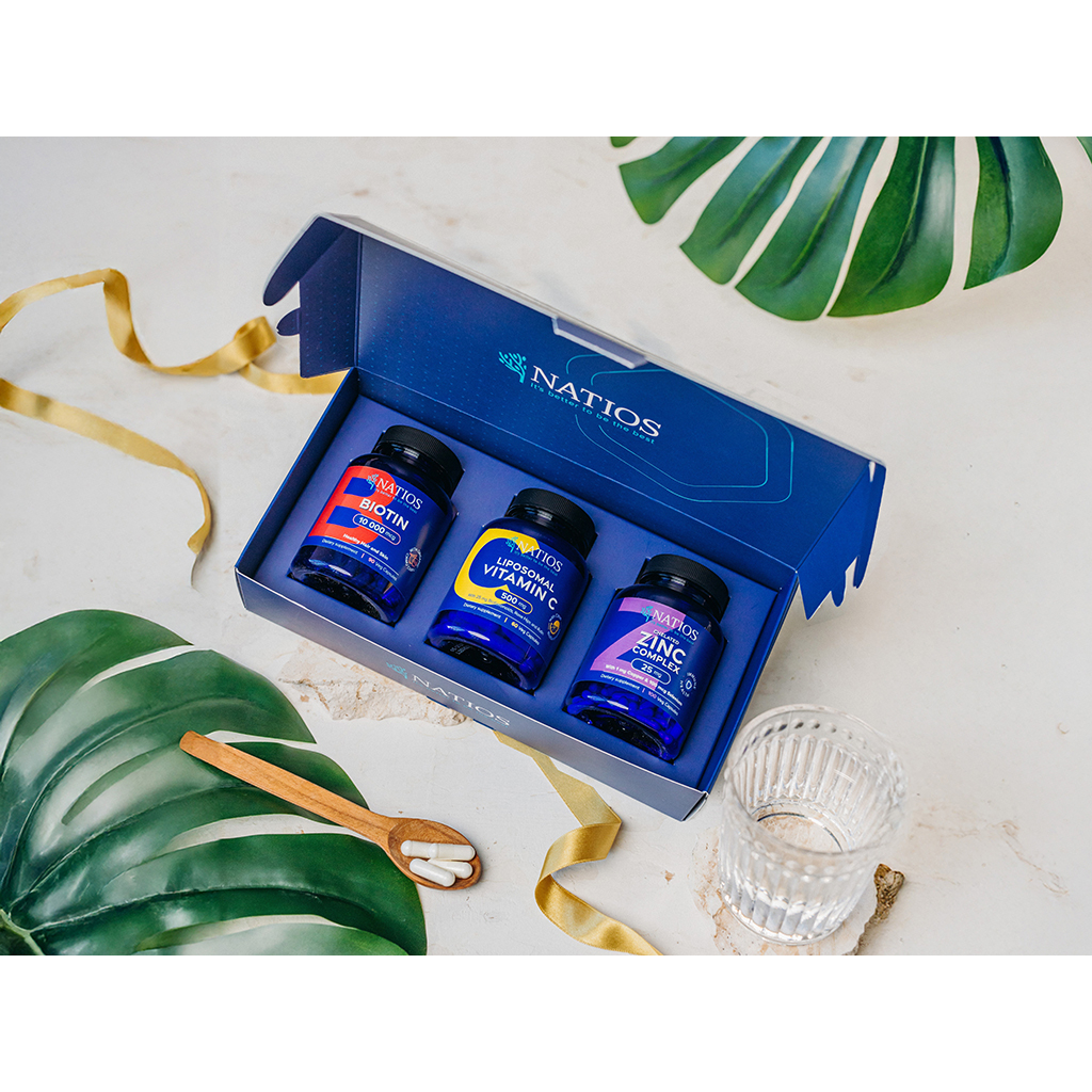 Krása začíná uvnitř – a tento balíček to ví. Spojuje tři pečlivě vybrané doplňky: NATIOS Biotin, NATIOS Zinc Chelated Complex a NATIOS Vitamin C Liposomální. Společně tvoří silnou kombinaci, která přispívá k přirozené vitalitě pokožky, zdravému vzhledu vlasů i pevnosti nehtů. Vyvážené dávky, vysoká vstřebatelnost a čisté složení – vše, co potřebujete pro vnitřní rovnováhu a sebevědomí každý den.