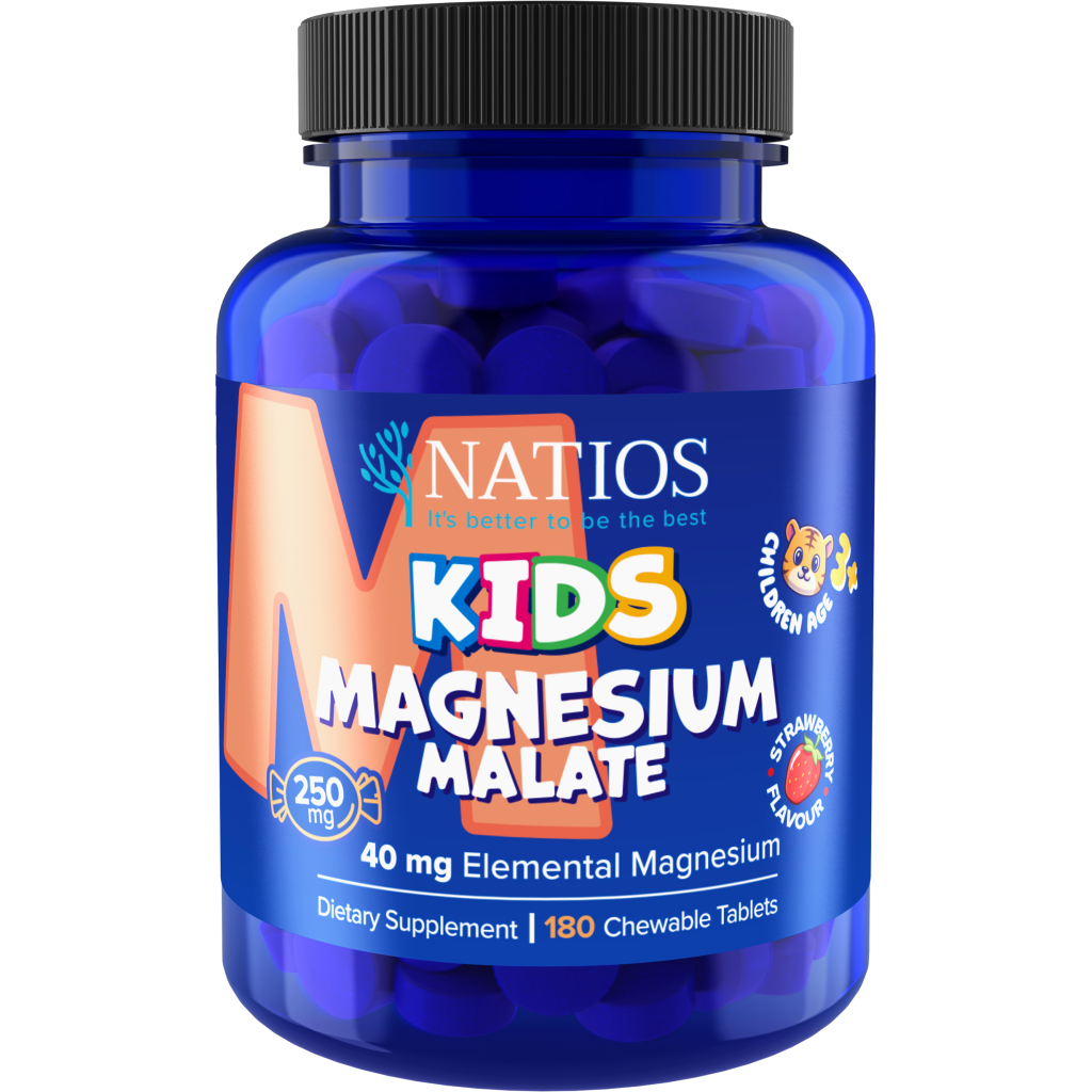 NATIOS Kids Magnesium Malate – lehce vstřebatelná forma hořčíku v chutných cucacích tabletkách s přírodní jahodovou příchutí. Vhodná pro děti od 3 let – ideální pro každodenní doplnění hořčíku hravou a příjemnou formou.