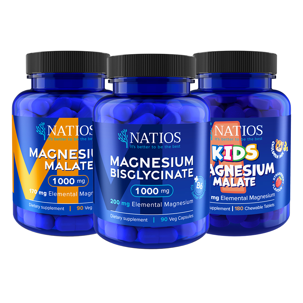 NATIOS Výhodné balení Hořčíky pro celou rodinu - Hořčík Malát, Hořčík Bisglycinát, Kids Hořčík Malát